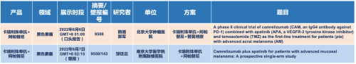 在黑色素瘤领域,尊龙凯时官网医药的卡瑞利珠单抗联合阿帕替尼(“双艾”组合)在2022 ASCO共入选1项口头报告和1项壁报展示。